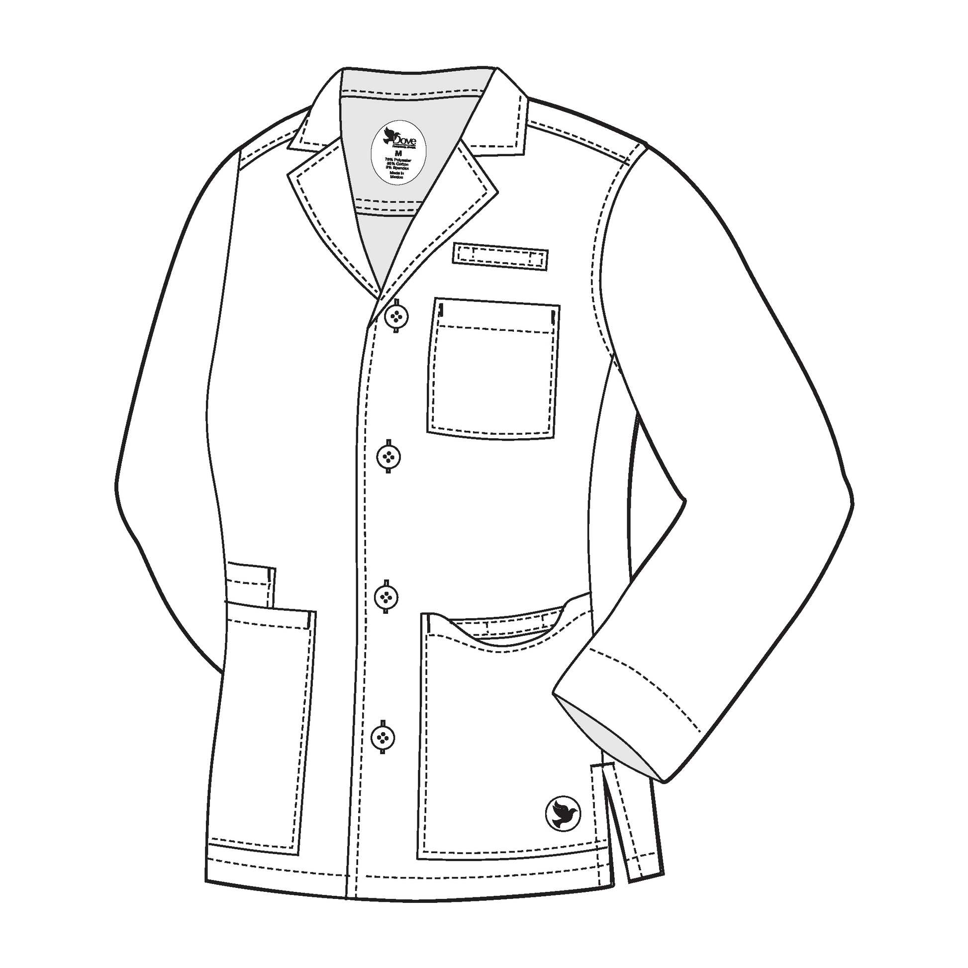 Long sleeve, hip length jacket with 2 hip pockets, one interior pocket with hook and loop closure, side vents, chest pocket, name pin holder, and straight sleeves.